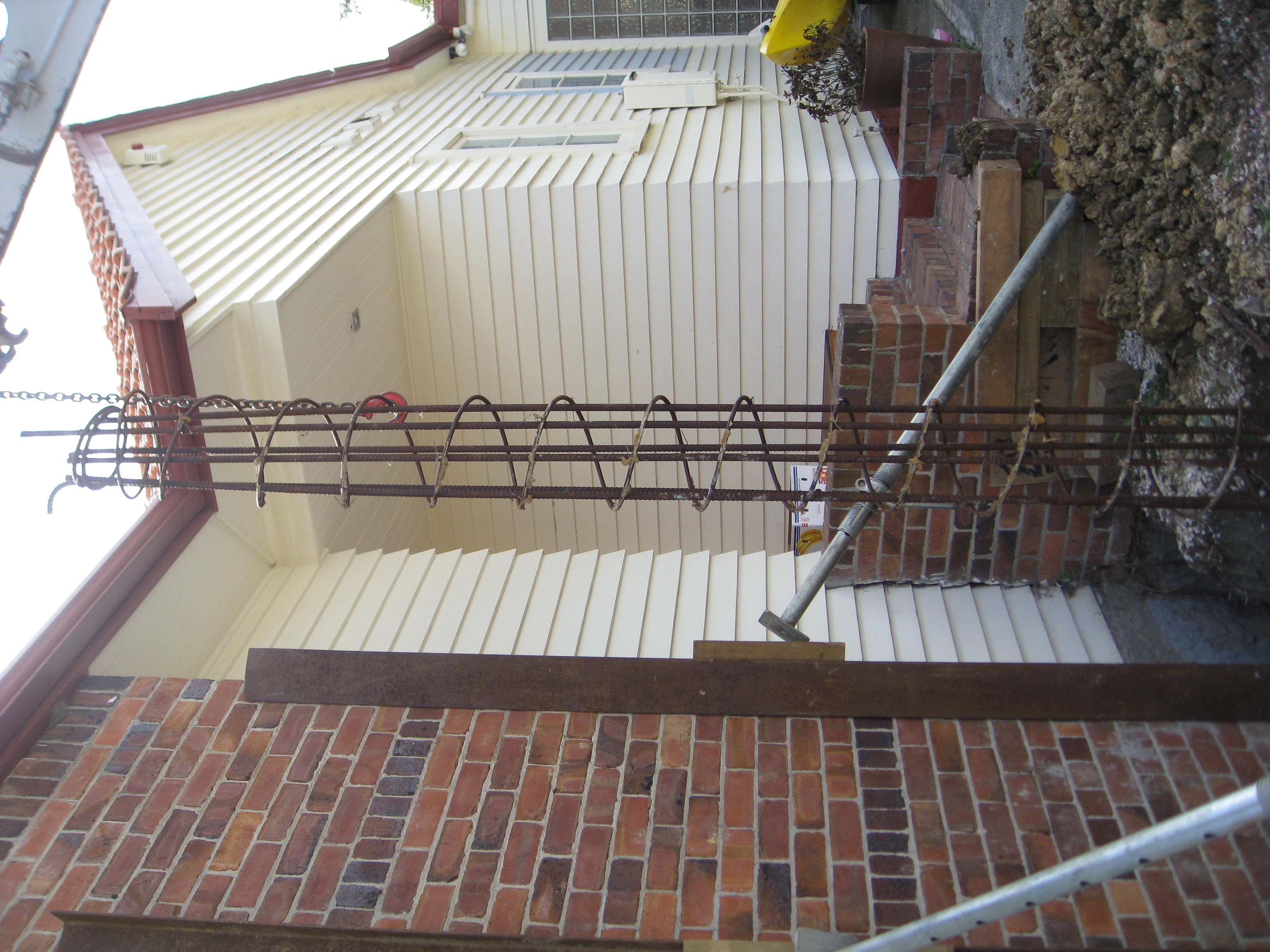 There are many methods of underpinning a property but the most common is placing friction type piles under the foundation wall. Holes are drilled beneath the existing footings of the external walls to a depth, width and spacing that has been determined by an engineer. The footing and top structure is hydraulically jacked up to level, at this point spiral reinforced steel piles cages are installed into the holes, the engineered spiral reinforced steel cages are then filled with concrete. This method is not suitable for all properties.